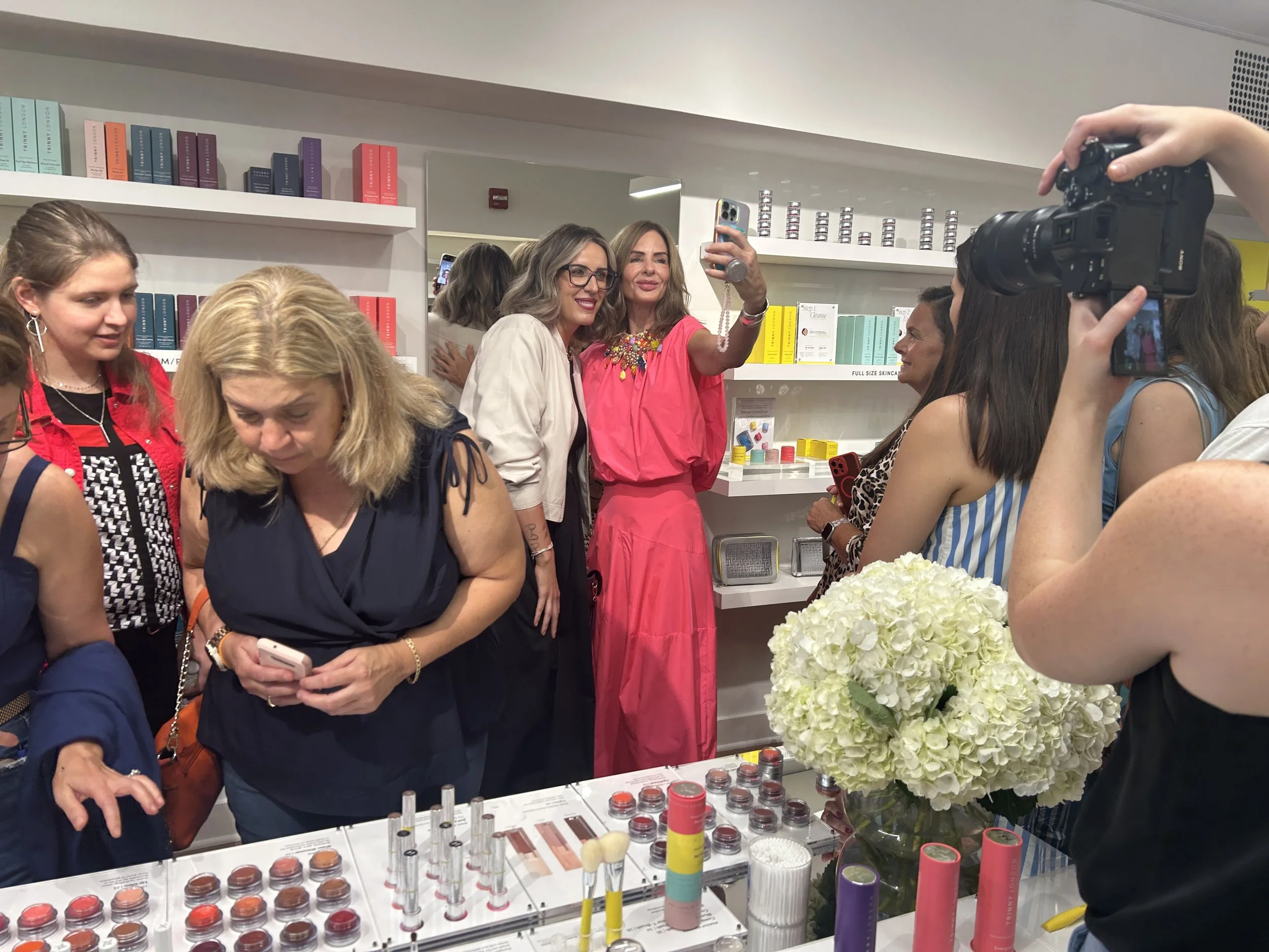 Case in point. On a floridly humid Saturday I joined about 70 women (mid-life and up) celebrating the opening of Trinny London’s canary-yellow Boston pop-up makeup and skin care store on Newbury Street. Conservatively dressed in the main (it was Boston, after all!) but by no means meek, the crowd was primed and ready when icon Trinny Woodhall arrived. In fact, everyone went wild. Trinny was exceptionally genuine and gracious, taking selfies with every attendee and offering quick words of advice and appreciation to each. (In our selfie, above, you can see I am wearing my Isabella Stewart Gardner antennae to welcome Trinny to Boston.)